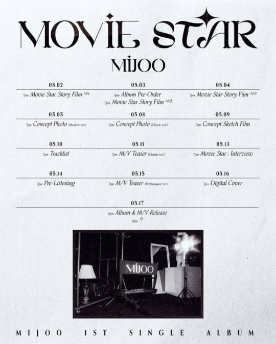 미주는 솔로 데뷔를 앞두고 콘셉트 포토, 트랙리스트, 뮤직비디오 티저, 프리 리스닝 등 다채로운 티징 콘텐츠를 차례로 선보인다. 특히 최근 오픈한 공식 유튜브 채널에 2일부터 3편의 스토리 필름을 업로드한다. 미주의 데뷔 시절부터 현재까지의 모습을 담아내며 'MOVIE STAR' 스토리와의 연결성을 가져갈 계획이다.