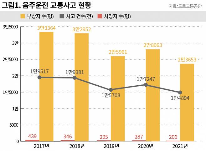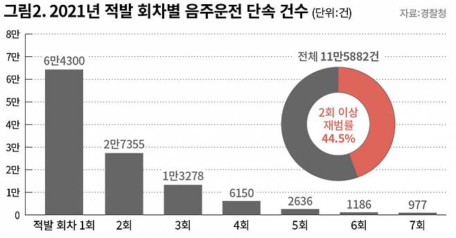 음주운전 교통사고로 목숨을 잃은 사람이 2021년 기준 206명이었다. 한 해 400명을 넘기던 예전에 비해 많이 감소한 수치이긴 하지만, 여전히 이틀에 한 명 넘는 꼴로 음주운전이 생명을 앗아가고 있다(〈그림 1〉 참조). 음주운전 적발 건수도 해마다 줄고 있지만 문제는 재범률이다. 2021년 기준 음주운전으로 2회 이상 적발된 사람이 전체의 44.5%다. 음주운전자 절반 가까이가 ‘상습범’이다. 누적 7회 이상 적발된 건수도 977건에 달한다(〈그림 2〉 참조).