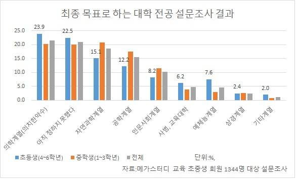 의대 진학을 목표로 한다는 답변의 비중은 초등생이 중학생보다 더 높았다. 중학생의 경우 응답자 842명 중 21.6%가 의학계열 대학을 목표로 하고 있다 답변했다. 설문에 참여한 학생들은 의대 진학에 이어 최종 목표로 하는 대학 전공을 아직 정하지 못했다는 답변이 20.9%로 뒤를 이었고, 자연과학계열(18.7%), 공학계열(15.5%), 인문사회계열(10.3%) 등의 순으로 답했다.