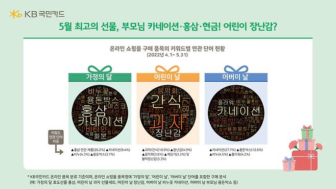 2일 국민카드는 5월 가정의 달을 맞아 온라인 쇼핑몰 중 매출액 상위 565개 가맹점의 구매 품목 데이터를 분석한 결과 이같이 나타났다고 밝혔다.