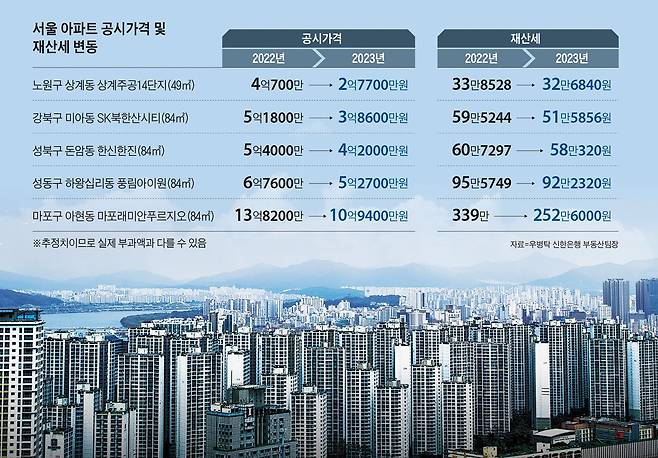공시가격이 작년 5억1800만원에서 올해 3억8600만원으로 떨어진 강북구 미아동 SK북한산시티 84㎡는 재산세가 59만5244원에서 51만5856원으로 13.3%(7만9388원) 줄어든다. 성동구 하왕십리동 풍림아이원 84㎡의 재산세는 95만5749만원에서 92만2320원으로 3만원 정도 낮아진다.
