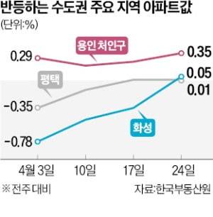 용인 처인구는 지난 3월 삼성전자가 처인구 남사읍 일대에 300조원을 투자해 반도체 클러스터를 조성한다고 발표한 이후 5주 연속 상승세를 이어가고 있다. 주변 지역도 하나둘 회복세를 나타내고 있다. 2주 전 상승 전환한 화성은 지난주 0.01%로 오름세를 이어갔다. 평택과 오산은 각각 0.05%, 0.10% 오르며 상승 전환에 성공했다.