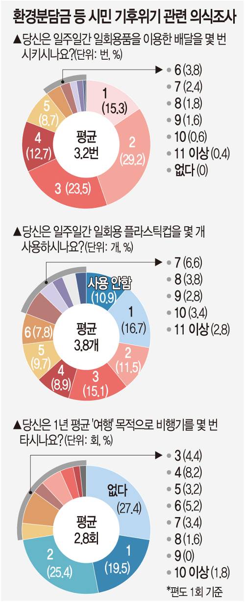 다만 환경적 의식이 친환경적 실천 태도로 곧장 이어지진 않았다. 503명에게 1주일간의 일회용 플라스틱컵 사용 개수를 조사한 평균치는 3.8개였다. 시민들은 일회용기에 담긴 형태의 음식 배달을 1주일에 평균 3.2회 이용했다. 성인 1명이 1년간 플라스틱컵 198개를 이용하고, 일회용기 배달 음식을 166회 주문하는 셈이다. “불가피한 상황까지 감안하더라도 절대적인 이용량이 일단 많다”는 것이 전문가들의 평가다. 석유를 증류해 만드는 플라스틱은 생산될 때와 폐기될 때 탄소를 배출한다. 온난화 요인이 될 뿐만 아니라, 미세플라스틱의 경우 생태계 전체의 건강을 위협한다.