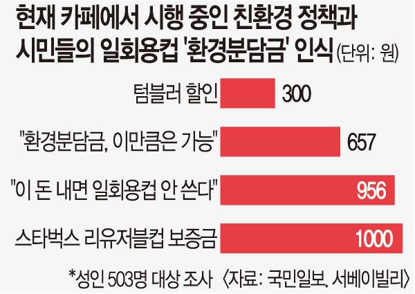 국내 커피전문점들은 텀블러를 가져오는 고객에게 음료 가격의 100~500원을 할인하고 있다. 이는 응답자들이 환경오염 억제 효과가 있을 것으로 판단했거나 스스로 분담하겠다는 환경분담금 액수보다 낮다. 홍수열 자원순환사회경제연구소장은 “사업자들이 다회용기를 제공하게 하는 시스템 도입을 병행하면서 소비자들도 그 부담을 함께 하는 방향으로 변해야 한다”고 말했다.