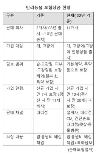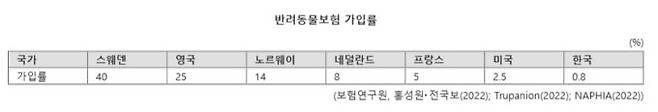 손해보험업계에 따르면 2022년 기준 총 11개 손해보험사가 약 7만 1896건의 펫보험 상품을 판매하고 있다. 그러나 가입률은 추정 전체 반려동물 개체수 대비 0.9%에 그쳤다. 업계는 펫보험 가입률이 저조한 원인을 △제도적 기반 미흡 △통계 및 데이터 부족으로 인해 보험료 산정 및 손해율 관리가 어려운 점 등에 있다고 봤다. 업계 관계자는 "반려동물 진료와 관련한 관리체계가 부족해 반려인의 진료비 부담, 낮은 보험가입률 등으로 이어지고 있어 제도개선이 필요하다"고 강조했다.