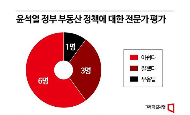 아시아경제가 부동산 전문가 10명을 대상으로 설문조사를 진행한 결과 윤석열 정부의 부동산 정책에 대해 응답자 10명 중 6명은 ‘아쉽다’고 답했다. 반면 응답자 3명은 잘하고 있다고 봤다. 1명은 답변하지 않았다.