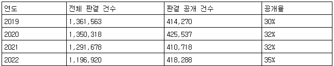 2019년 국회에서 열린 '판결문 공개 확대를 위한 국회토론회' 자료집을 보면, 과거 종합법률정보시스템을 통해 공개된 판결문은 전체 대법원 판결의 3%, 각급 법원 판결의 0.003%에 불과했다는 걸 알 수 있다.