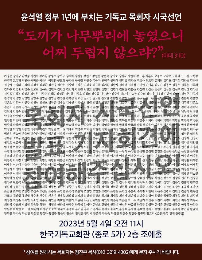 ‘윤석열 정부 1년에 부치는 기독교 목회자 시국선언’ 준비위원들은 4일 오전 11시 서울 종로5가 한국기독교회관 2층 조에홀에서 ‘목회자 시국선언’을 진행한다. 이들은 3일 공개한 ‘도끼가 나무뿌리에 놓였으니 어찌 두렵지 않으랴?’라는 제목의 선언문에서 오는 10일 집권 1년을 맞는 윤석열 정부에 대해 “윤석열 정부 1년 동안 민생은 파탄 나고 평화는 무너지고 민주주의는 후퇴 일로에 있고, 검찰 권력의 공고화로 협치와 국민통합이 실종되었고, 반노동, 반농민정책으로 국민들이 궁지로 몰리고 있다”면서 “온 나라에 재앙이 몰려오고 있다”고 개탄했다.