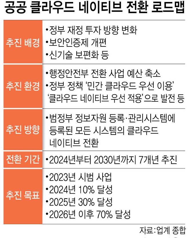 행안부는 정부의 재정 투자 방향 변화, 보안인증(CSAP) 제도 개편, 신기술 보편화 등 정책환경 변화에 따라 종전 계획(2021~2025년, 1만9개 시스템)을 클라우드 네이티브 전환 로드맵으로 변경한다고 밝혔다. 클라우드 네이티브는 클라우드 성숙도 최고 단계로, 클라우드의 기능과 장점을 최대한 활용해서 애플리케이션(앱)을 구축·실행하는 것을 의미한다.