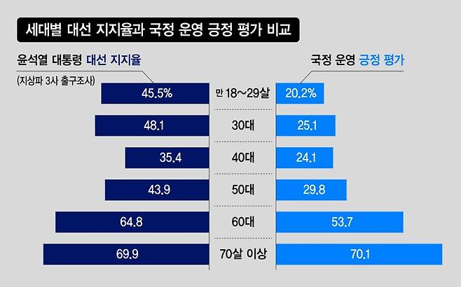 지난 대선에서 고령층을 제외하면 30대 다음으로 윤 대통령에게 많은 지지(45.5%·방송사 출구조사 기준)를 보냈던 20대의 국정운영 평가가 가장 부정적인 점도 눈에 띄는 대목이다. 윤 대통령의 국정운영에 대해 전체 응답자의 36.1%가 긍정평가를 한 데 견줘 20대에선 20.2%만이 긍정적으로 평가했다. 2030세대가 전반적으로 이탈한 것이다.