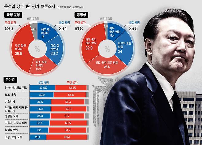 윤 대통령 1년 부정 평가, ‘매우 잘못’이 ‘다소 잘못’의 2배