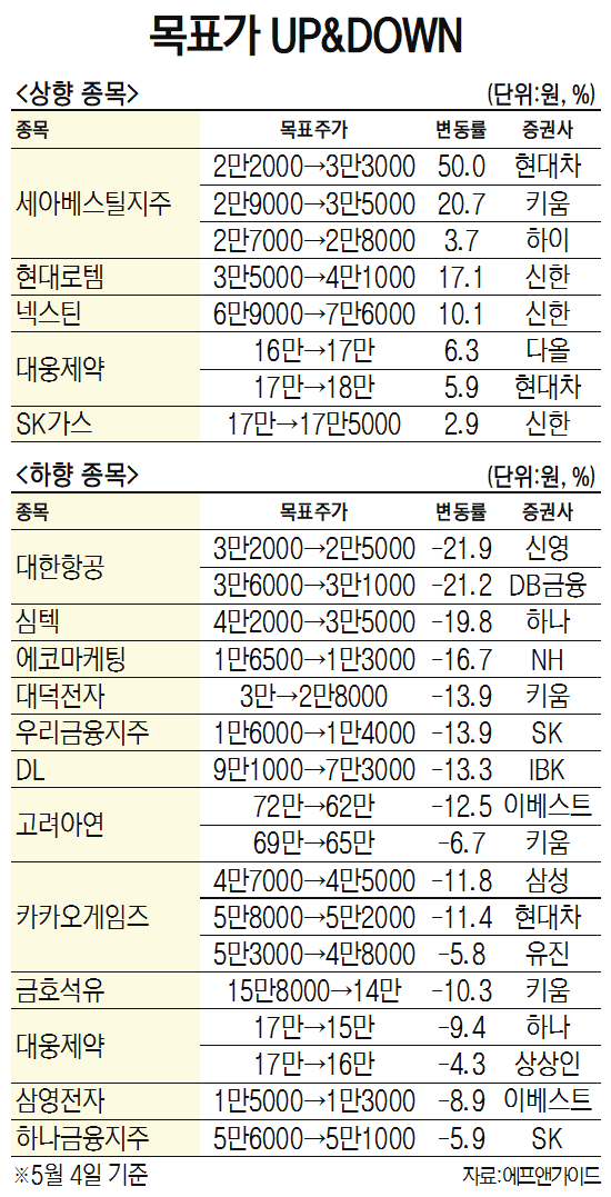 반면 이날 목표주가가 가장 많이 내려간 종목으로는 대항항공이 이름을 올렸다. 신영증권은 올해 대항항공은 감익이 진행될 거라면서 투자의견을 중립으로 내리면서 목표주가를 2만 8000원에서 2만 5000원으로 21.9% 하향했다. 엄경아 신영증권 연구원은 “단기적으로 연말까지 코로나19 이전 여객 수준의 최대 80%까지 회복하는 것이 목표지만 현재 70% 수준이라 실현 가능한 수준”이라면서도 “수하물 공급 증가로 화물 시장의 운임하락 움직임이 지속되는 등 수익성 저하는 진행형이라 목표주가 적용배수를 높일 단계라고 보기 어렵다”고 말했다.