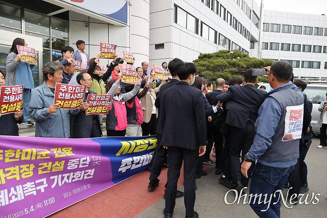 | ▲ '주한미군 전용 사격장 건설 중단 및 폐쇄 창원대책위'는 4일 오전 창원특례시청 현관 앞에서 기자회견을 열어 "주한미군 사격장 공사 당장 중단하고 폐쇄하라"고 촉구했다. 기자회견에 앞서 청원경찰들과 실랑이가 벌어졌다. |