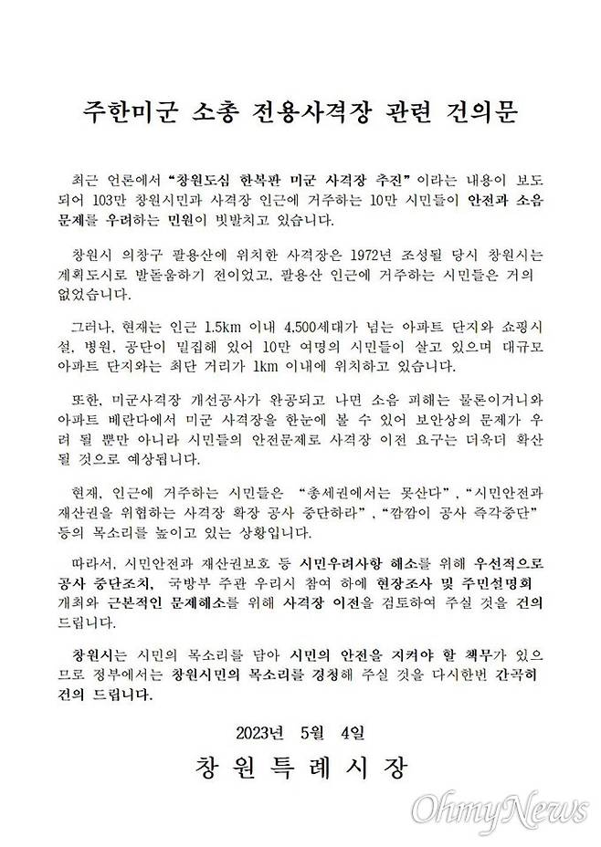 | ▲ 창원특례시는 국방부에 "주한미군 소총 전용 사격 관련 건의문"을 냈다. |