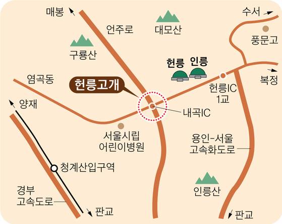 그런데 헌릉고개는 어디일까. 정경연 인하대 정책대학원 초빙교수(정통풍수학회 명예이사장)는 “왕복 10차로 도로를 만드느라 깎이고 패여서 완만해졌지만, 지금의 분당내곡간도시고속화도로 내곡IC 지점이 헌릉고갯마루”라고 밝혔다. 헌릉고개로 사람 통행도 모자라 차들이 쌩쌩 달리니, 세종의 역린(逆鱗·군주의 노여움)이 크지 않을까 싶기도 하다.