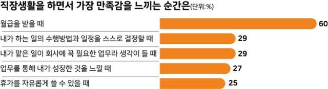 월급이 직장인들에게 가장 큰 만족감을 주는 것은 사실이지만 업무자율성과 의미, 일을 통한 성장 또한 직장 만족도에 영향을 주는 요인들이다. 20대는 업무를 통한 성장을 느낄 때(37%), 40대 이상은 내가 맡은 일이 회사에 꼭 필요한 주요 업무라는 생각이 들 때 만족감을 느낀다. 기존 세대는 회사에 본인이 기여했다고 느낄 때 만족감을 느끼는 반면, 2030세대는 본인의 성장과 자율성을 느낄 때 만족감을 느끼는 것으로 볼 수 있다.