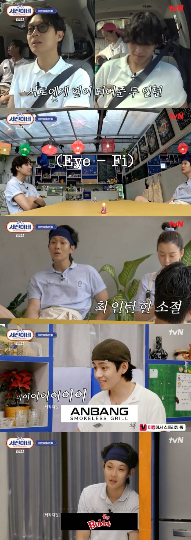 영업이 끝난 뒤에도 뷔는 핫도그 재료에 반죽을 묻히고 있었고, 박서준은 "연습하는 거냐. 너 내일 간다"라며 놀랐다. 그러나 곧 뷔가 팬들을 위한 음식을 준비하고 있었다는 걸 알곤 "팬들 주려고 하는 거냐. 그럼 다 만들자. 나도 몇 개 해놓겠다"라며 일을 도왔다.