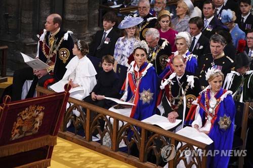 From left, 1st row, Prince William, Princess Charlotte, Prince Louis, Kate Princess of Wales, Prince Edward Duke of Edinburgh and Sophie, the Duchess of Edinburgh at the coronation ceremony of King Charles III and Queen Camilla in Westminster Abbey, London, Saturday May 6, 2023. (Yui Mok, Pool via AP) POOL PHOTO