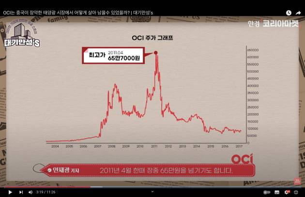 이렇게 주도주 하면 빠지지 않고 나오는 역대급 회사가 꼭 있어요. OCI, 옛날 이름은 동양제철화학이에요. OCI, 정말 대단했던 회사죠. 전성기는 2010년, 2011년이었어요. 이때는 태양광이 시장을 지배했는데. 그중에서도 '대장주'로 통했습니다.