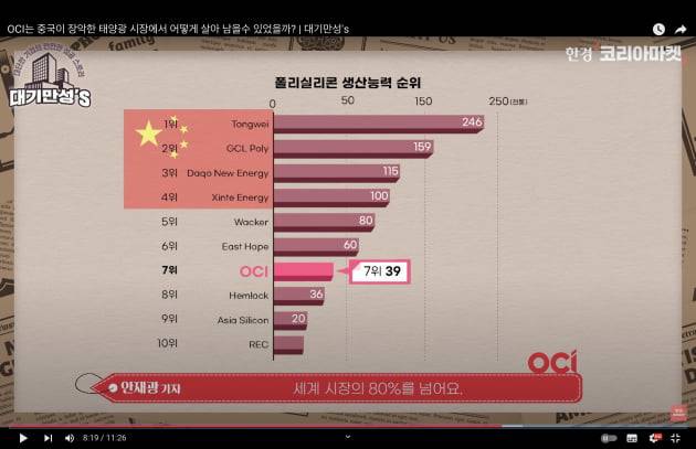 그리고 그사이 폴리실리콘 업계는 완전히 중국이 장악했죠. OCI는 생산량 기준 6위쯤하고. 과거 1, 2위 했던 독일의 바커나 미국의 헴록도 저 밑으로 내려갔어요. 위에는 전부 다 중국 업체입니다.