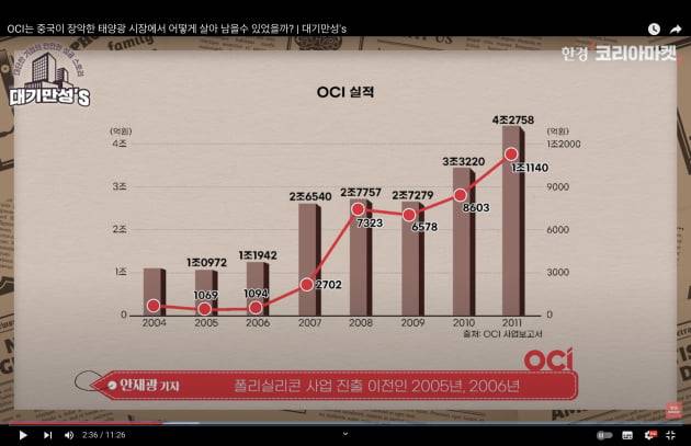 폴리실리콘 사업이 얼마나 잘 됐는지 실적을 한번 볼까요. 폴리실리콘 사업 진출 이전인 2005년, 2006년 이땐 매출이 1조원 안팎. 영업이익은 1000억원. 매출이 대기업처럼 엄청나게 크진 않지만 나름 꽤 알짜 회사란 느낌이 있죠. 그런데 폴리실리콘 사업 진출 후 4년이 지난 20011년 매출은 4조2000억원. 영업이익은 1조원을 넘겼어요. 영업이익 기준 10배가 단 4년 만에 증가한 겁니다.
