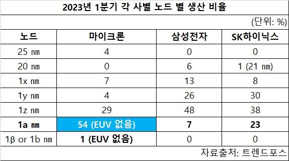 대만에서는 마이크론이 지난 2021년 세계에서 처음으로 양산한 10나노급 4세대(1a·1알파) D램 생산이 주로 이뤄집니다. 올해 1분기 마이크론은 회사 생산 D램의 50% 이상이 1a 제품입니다. 삼성전자가 같은 시기 7%, SK하이닉스가 23%인 것에 비하면 상당히 높은데요. 두 회사와 달리 4세대 제품에 EUV를 선택하지 않고 비용보다는 ‘기술 진도 빨리 빼기’를 택하며 이런 현상이 나타난 것으로 해석됩니다. 결론적으로 대만은 마이크론이 가장 공들이는 D램을 생산하는 전초 기지라는 게 핵심입니다.