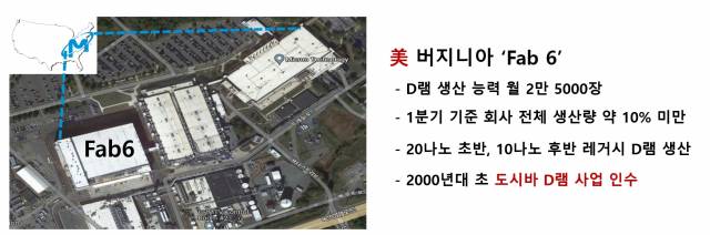 또한 2002년에는 도시바의 D램 사업을 인수하면서 이들의 버지니아 공장을 사들였습니다. 현재 여기서 생산하는 D램 양은 월 약 2만5000장으로 회사 전체 D램 생산량의 10%에도 못 미칩니다. 이곳에서는 20나노, 10나노 후반대 공정으로 차량용 메모리 등 레거시 제품을 생산하는 것으로 알려졌습니다.
