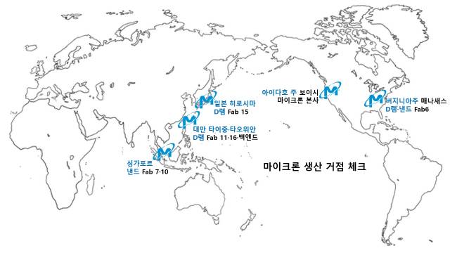 우선 시작하기 전에 아래 지도를 보시면서 마이크론 테크놀로지의 생산 거점을 쭉 한번 훑어주시고요. 본사가 있는 미국보다 D램 생산 기지가 있는 대만부터 출발해보겠습니다.