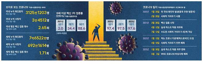 3년4개월간 전 세계를 공포에 몰아넣었던 코로나19 팬데믹 비상사태가 드디어 해제됐다. 그동안 수많은 감염자와 사망자가 발생해 충격을 줬을 뿐만 아니라 긴급 승인된 백신과 접종 의무화, 사회적 거리두기 등 각종 방역정책을 놓고 숱한 논란이 일기도 했다. 주요 방역정책을 둘러싼 논란과 평가를 정리해본다. 코로나19 팬데믹 기간 백신 접종과 방역패스는 거리두기와 함께 'K방역'을 떠받치는 핵심 조치였다. 코로나19 백신 접종은 2021년 2월 의료진을 시작으로 1분기 요양병원 입소자와 종사자, 2분기 65세 이상 노인, 3분기 19~64세 성인 등 순으로 진행됐다. 목표는 같은 해 11월 전 국민 집단면역 형성이었다.