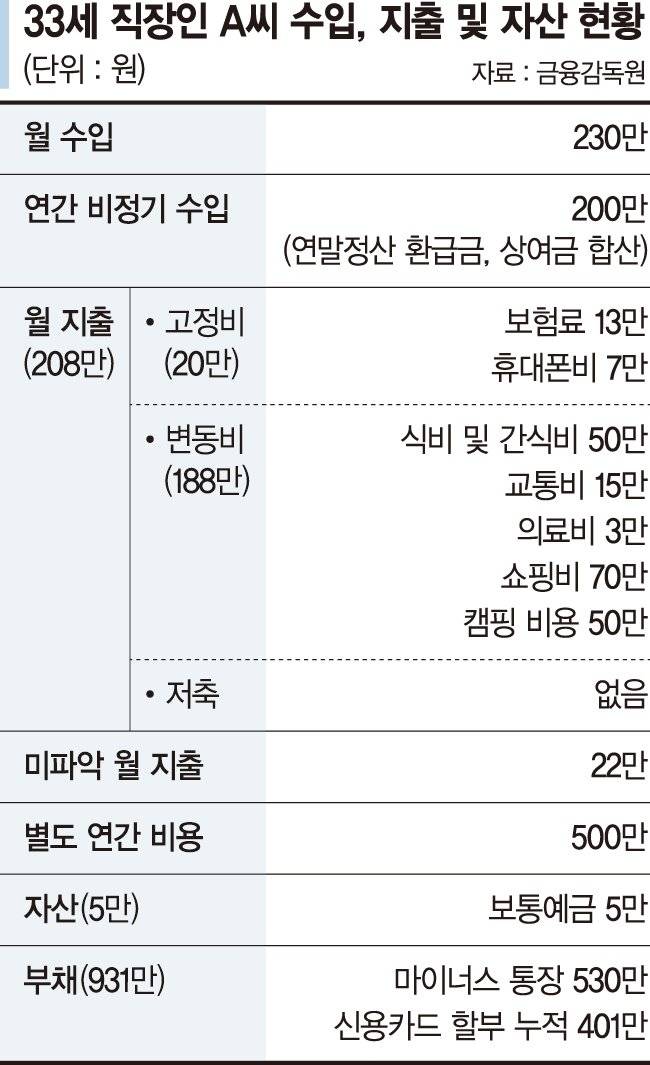 A. A씨(33)의 월 수입은 230만원이다. 이와 별도로 연말정산 환급금과 상여금을 합쳐 연간 비정기 수입으로 200만원이 잡힌다. 월 지출은 208만원이다. 보험료(13만원), 휴대폰비(7만원) 등 고정비로 20만원이 나가고, 식비·간식비(50만원)를 비롯해 교통비(15만원), 의료비(3만원), 쇼핑비(70만원), 캠핑 비용(50만원) 등 변동비로 188만원이 쓰인다. 저축은 못하고 있다. 때문에 자산은 보통예금에 들어 있는 5만원이 전부다. 용처가 파악되지 않은 금액은 22만원이다. 월 지출과 별개로 연간비용 800만원도 든다. 부채로는 마이너스통장(530만원), 신용카드 할부누적(401만원) 등이 있다.