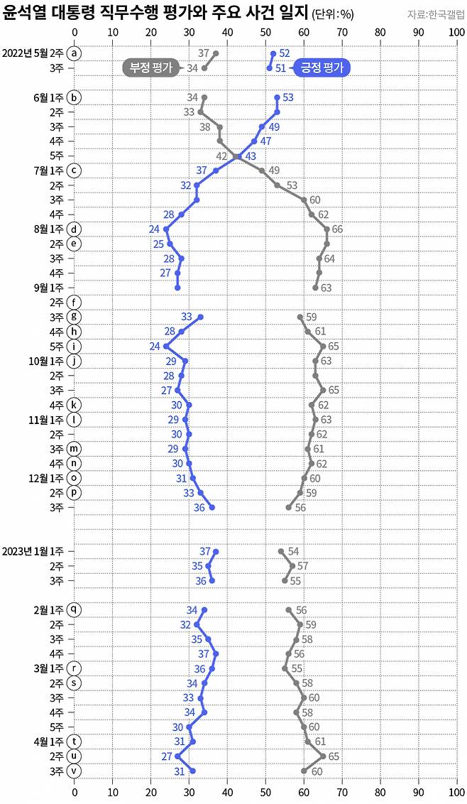 한국갤럽은 지난해 5월10일 윤석열 정부 출범 이후 한 해 동안(2023년 4월 셋째 주까지, 명절 연휴 등 제외) 매주 '대통령이 직무를 잘 수행하고 있느냐'고 물었다.