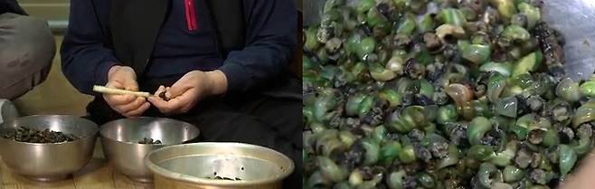 삶은 다슬기는 일일이 이쑤시개나 바늘로 살살 돌려가며 빼주는데요.