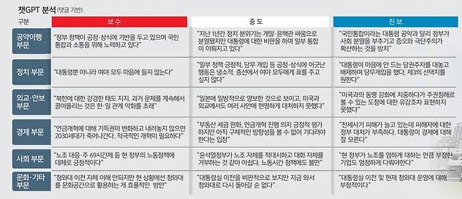 중도층 생각은 “일부 정책은 긍정적으로 평가하지만 당무 개입 등 공정·상식에 어긋난 행동들은 냉소적으로 보고 있다”는 문장으로 정리됐다. 챗GPT는 중도층의 윤 대통령에 대한 평가가 엇갈리고 있어 윤 대통령의 앞으로의 행보와 정치적 결정에 따라 중도층의 반응은 지속해서 변화할 것으로 전망했다. 내년 총선에서 ‘정권 안정’과 ‘정권 견제’ 중 어떤 결과가 나와야 한다고 생각하는지 묻는 말에는 정치성향을 막론하고 “제3의 선택지가 필요하다”는 내용이 다수 나왔다.