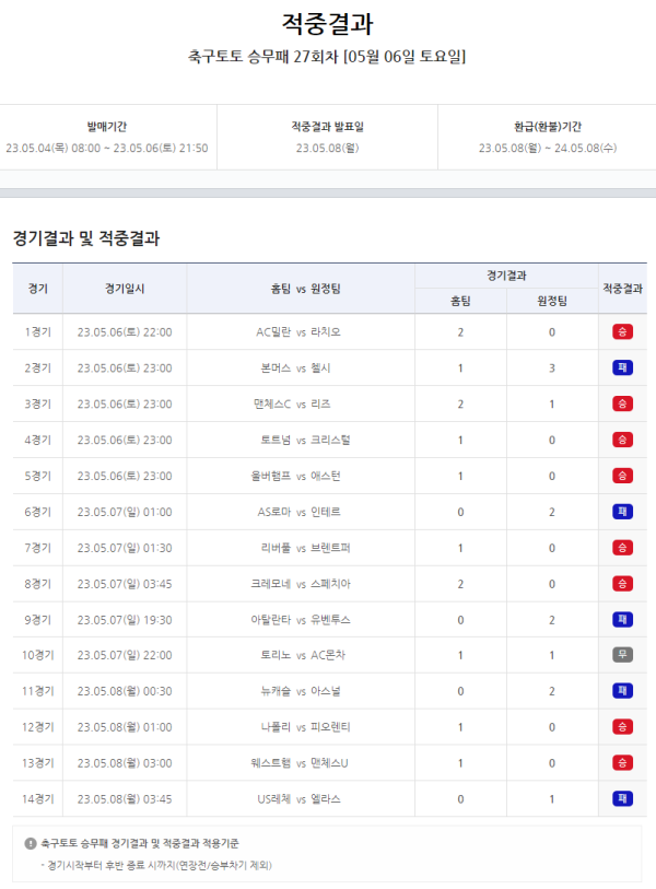 스포츠토토 축구토토 승무패 27회차, 총 1만 5천건 적중 성공