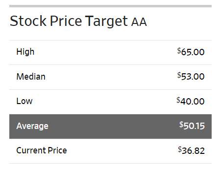 한편 월가에서 알코아에 대해 투자의견을 제시한 애널리스트는 총 14명으로 이중 7명(50%)이 매수 의견을 유지하고 있다. 평균 목표주가는 50.2달러로 이날 종가보다 36.2% 높다.