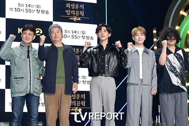 [TV리포트=백수연 기자] 박석형 PD, 강승원 음악감독, 그룹 잔나비 최정훈, 멜로망스 정동환, 이창수 PD가 9일 오후 서울 여의도 KBS 신관공개홀에서 KBS2 '더 시즌즈-최정훈의 밤의 공원' 제작발표회에서 포즈를 취하고 있다.