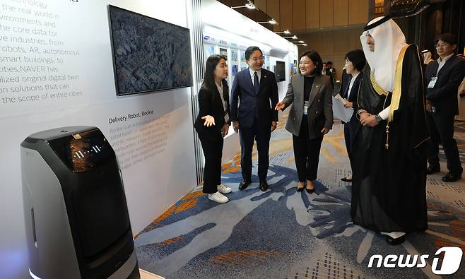 (서울=뉴스1) 안은나 기자 = 원희룡 국토교통부 장관과 살레 빈 나세르 알 자세르 사우디아라비아 교통물류부 장관이 9일 서울 종로구 포시즌스호텔에서 열린 제2회 한-사우디 모빌리티 및 혁신 로드쇼에서 네이버의 자율주행 서비스 로봇 '루키'를 보고 있다. 2023.5.9/뉴스1