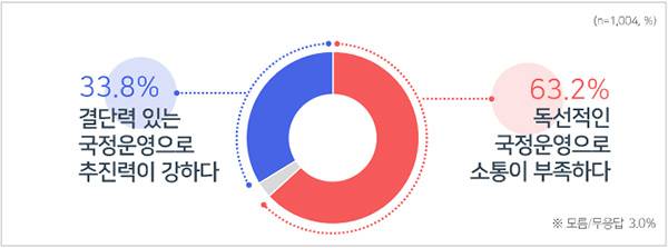 윤 대통령의 국정운영 스타일에 대해서는 '독선적인 국정운영으로 소통이 부족한다고 본다'는 응답이 63.2%로, '결단력 있는 국정운영으로 추진력이 강하다고 본다' 33.8%보다 높게 나타났습니다.