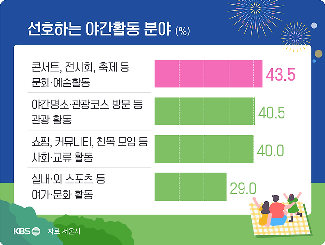이 조사 결과를 보면 서울시민들은 일을 마친 뒤 야간에 문화 예술을 향유하거나 타인과의 친목과 교류를 원한다는 것을 알 수 있습니다.