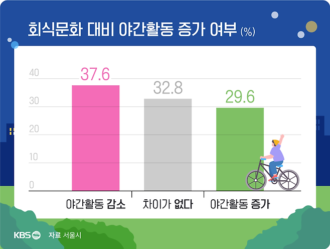 다른 야간활동이 증가했는지를 묻자 '그렇지 않다'는 응답이 37.6%, '큰 변화가 없다'는 응답은 32.8%였고 '그렇다'는 응답은 29.6%였습니다.