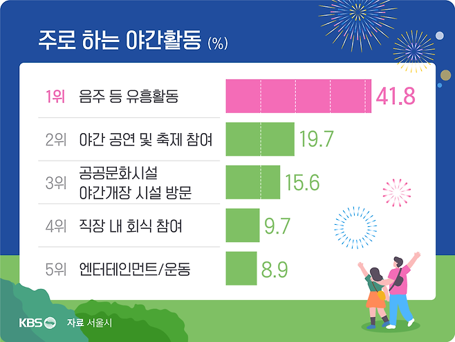 주로 하는 야간활동으로는 음주 등 '유흥활동'이 41.8%로 가장 많았습니다. 야간 공연 및 축제 참여가 19.7%, 공공문화시설 방문이 15.6%로 뒤를 이었습니다.
