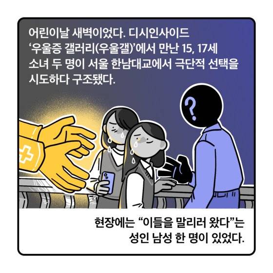 하필 어린이날 새벽이었다. 우울갤에서 만난 15, 17세 소녀 두 명이 서울 한남대교에서 극단적 선택을 시도하다 구조됐다. 두 소녀는 과정을 소셜미디어로 생중계했고, 현장에는 “이들을 말리러 왔다”는 성인 남성 한 명이 있었다. 지난달 16일 우울갤 이용자인 여고생이 서울 강남 한복판에서 투신 사망해 충격을 안긴 지 한 달도 안 된 시점이다. 그때도 과정이 소셜미디어로 생중계됐고, 20대 남성이 동행했다. 이 20대 남성은 자살방조와 자살예방법 위반 혐의로 입건됐다. 여고생이 우울갤에서 성착취를 당했을 가능성도 제기되고 있다.