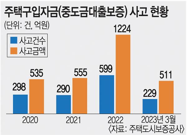 9일 국회 국토교통위원회 소속 김학용 국민의힘 의원이 주택도시보증공사(HUG)로부터 제출받은 자료에 따르면 지난해 말 기준 HUG의 주택구입자금(중도금대출 보증) 사고 건수는 599건으로 집계됐다. 이는 2020년(298건), 2021년(290건)의 배 수준이다. 사고금액 역시 1224억원으로 2020년(535억원), 2021년(555억원)보다 배 이상 늘었다. 올해 3월 말 기준 사고금액은 511억원으로 이 추세라면 지난해 수준을 크게 웃돌 것으로 보인다. 중도금대출 보증은 입주 예정자가 금융기관으로부터 대출받는 주택 구입자금의 원리금 상환을 책임지는 보증 상품이다. 중도금대출 보증사고는 금융기관에서 이자 미납 또는 원금 미상환 등 기한이익상실 사유로 인해 보증기관에 사고를 통지한 경우 발생한다.