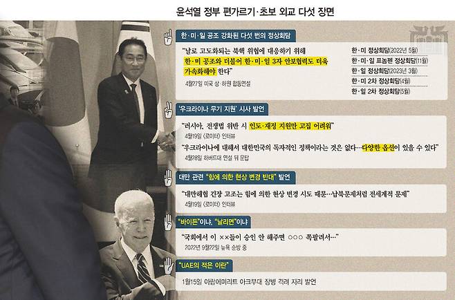 이 과정에선 미국 도·감청 문건 공개에도 ‘한-미 동맹’을 강조하거나 강제동원 피해를 인정하지 않는 일본에 “과거사 인식 문제는 일방의 상대에게 요구할 문제가 아니”라며 면죄부를 주는 태도에 ‘굴욕 외교’이란 비판에 부딪치기도 했다. 반면 러시아와 중국에 대해서는 ‘우크라이나 무기 지원’과 ‘대만 발언’으로 상대가 극도로 민감해하는 사안을 불필요하게 자극했다. 윤 대통령의 ‘말실수’도 여러차례 입길에 올랐다.