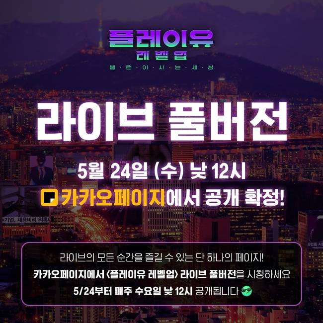 카카오엔터테인먼트 '플레이유 레벨업' 라이브를 압축 편집한 본편은 오는 5월 23일부터 티빙을 통해, 지난 라이브 풀버전 다시보기 VOD는 24일부터 카카오페이지를 통해 공개한다.