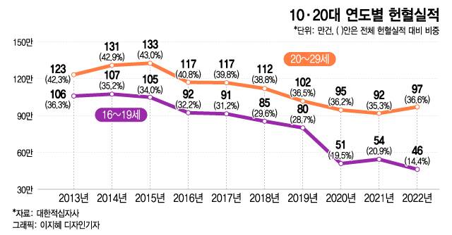 그러나 이들 연령대 헌혈 실적은 10년 새 꾸준하게 줄었다. 특히 10대의 감소 폭이 가팔랐다. 2016년 16~19세 헌혈 실적은 92만2574건을 기록해 100만건대가 깨졌다. 2018년에는 전체 헌혈 실적에서 이들 연령대가 차지하는 비중이 29.6%로 집계돼 30%대 벽이 무너졌다. 2013년부터 정확히 10년이 지난 지난해 헌혈 실적은 46만2186건(17.4%)이다. 2005년 통계 작성 시작 이후 역대 최저치다.