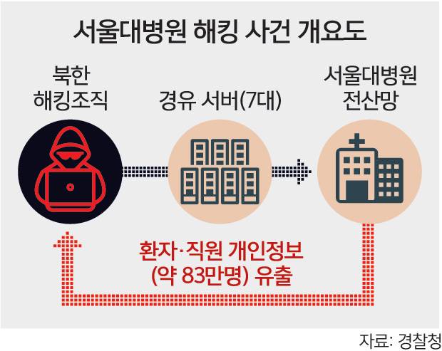 83만명의 개인정보가 유출된 정황이 확인된 ‘서울대병원 해킹 사건’에 대해 경찰이 북한 해킹조직의 소행으로 결론 내렸다. 서울대병원에서 진료받은 주요 인사의 개인정보 등을 빼내기 위한 것으로 추정된다.