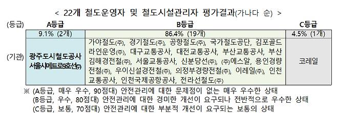 전체 철도운영자 등의 평균 점수는 86.74점(B등급)으로 2021년(86.35점, B등급)에 이어 전체기관 평균 B등급을 유지했다. 공항철도, 국가철도공단, 서울교통공사, 에스알(SR), 인천국제공항공사 등이다. 평가 등급별로 △A등급(90점대)은 매우 우수 △B등급(80점대)은 우수한 상태로 경미한 개선 요구 △C등급(70점대)은 부분적 개선이 요구되는 상태를 뜻한다.