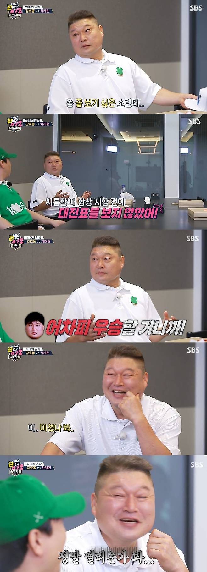 이어 그는 "좀 꼴 보기 싫은 이야기인데. 예전에 씨름 시합할 때 대진표를 보지 않았어. 어차피 목표는 우승이니까"라고 했다. 하지만 강호동은 이내 "미쳤나봐"라며 긴장해서 아무 말을 하는 자신을 언급, 웃음을 더했다.