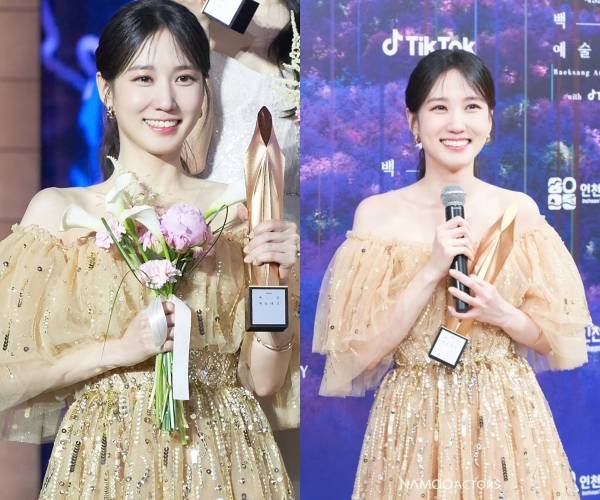 박은빈, 김갑수 저격 논란 속 ‘백상’ 비하인드컷 공개..대상 금빛 미소